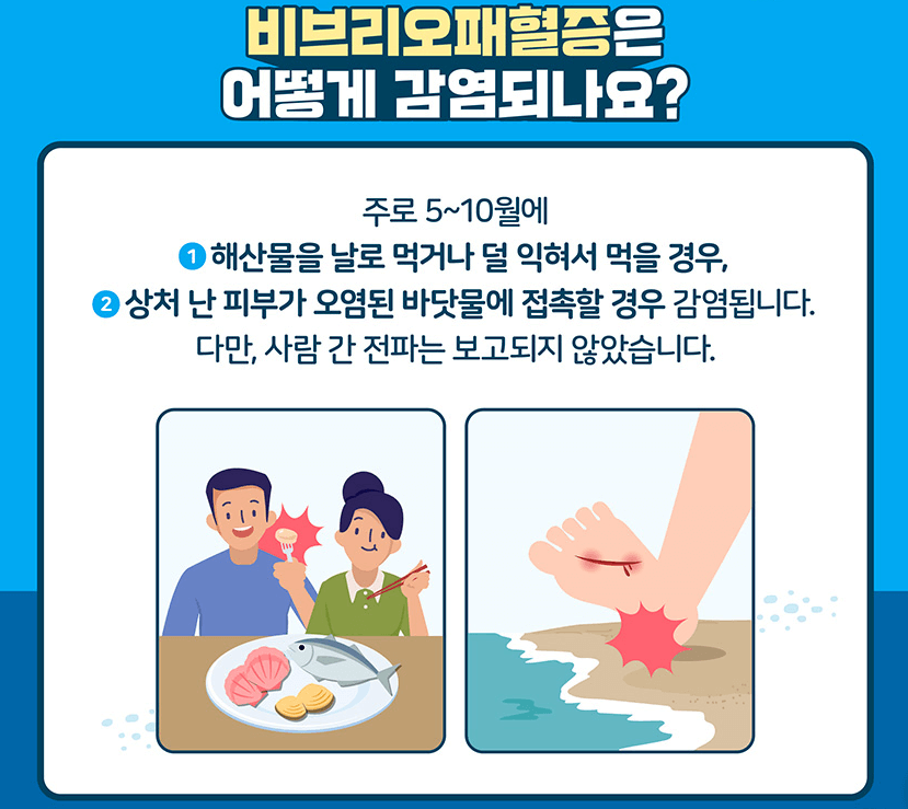 특히 여름철에는 비브리오 세균의 활동이 활발해지므로 해산물 섭취와 상처 관리에 주의가 필요합니다.